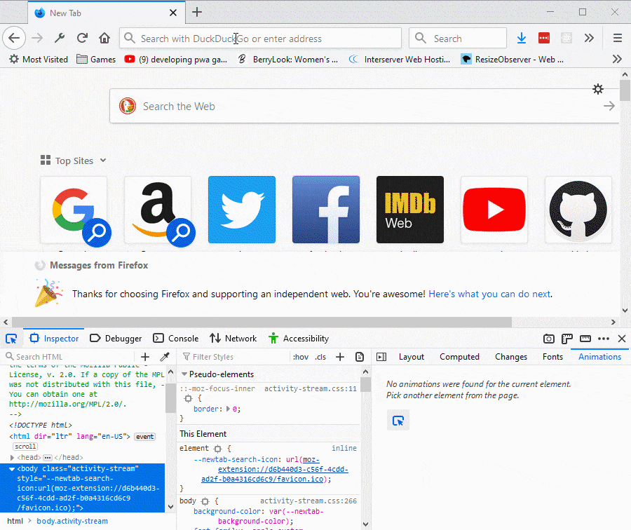 An animation showing the box moving around the edges of the screen. View the actual page. I opened the developer tools to show the animation inspector on the right of the Page Inspector. (Sorry for the flash but I accidentally moved my mouse over the inspector pane.)